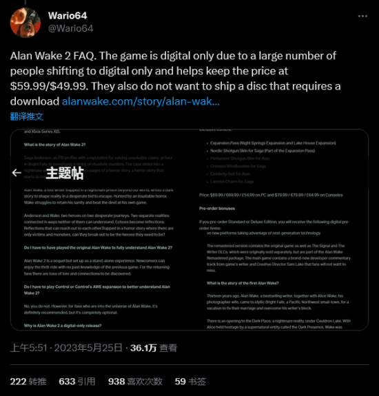 最近有许多 3A 大作已经纷纷涨价,从原本的 60 美元(59.99 美元)涨价至 70 美元(69.99 美元)的新定价。而不发行实体版,《心灵杀手2》能够在主机上以原本的 60 美元定价推出,而 PC 版则更加便宜,为 49.99 美元。