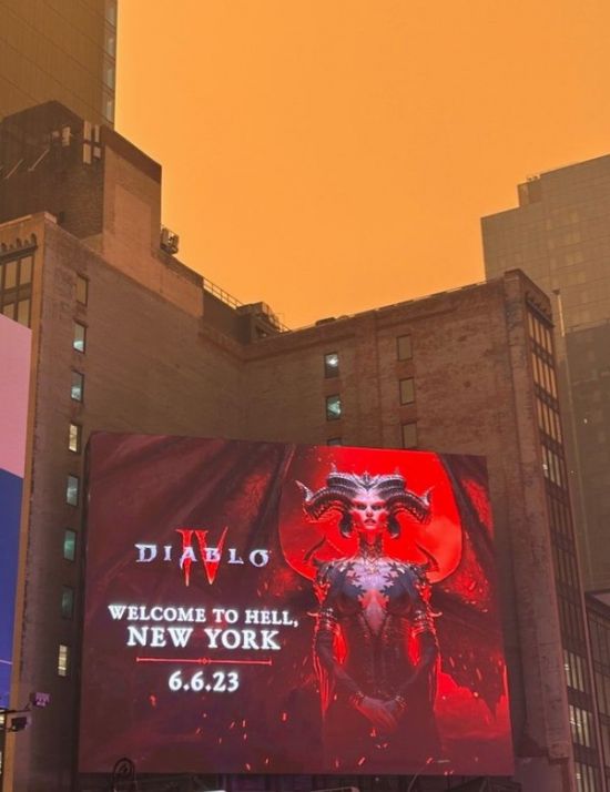 为了宣传《暗黑破坏神4》,暴雪在全球各大城市竖起了大量广告牌。纽约的“欢迎来到地狱”广告尤其吸引人,由于加拿大森林火灾,纽约被浓烟笼罩,而该广告在黄色天空下尤为凸显。