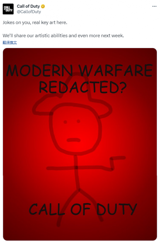 使命召唤官方推特今日发布了一张印有“MODERN WARFARE REDACTED”字样的图片,并表示将在下周分享更多内容,这有可能是官方在暗示将于下周正式公布《使命召唤:现代战争3》。