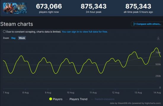 《博德之门3》于8月3日正式发售后,其取得的成绩令人瞩目。据SteamDB数据显示,8月13日晚《博德之门3》Steam同时在线人数突破87万,具体为875343人。与8月6日的814666人相比,又涨了6万多人。恭喜《博德之门3》,又达到了新的里程碑。