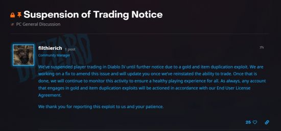 暴雪表示:“由于物品和金币复制漏洞,我们已经暂停了《暗黑4》中的玩家交易,直至另行通知。我们正在努力解决这一问题,并将在恢复交易功能后及时通知你。”