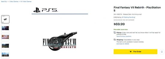 近日据外媒Gamespot报道,《最终幻想7:重生》已上架美国百思买 (Best Buy)开启预售,售价为69.99美元(约合人民币510元)。
