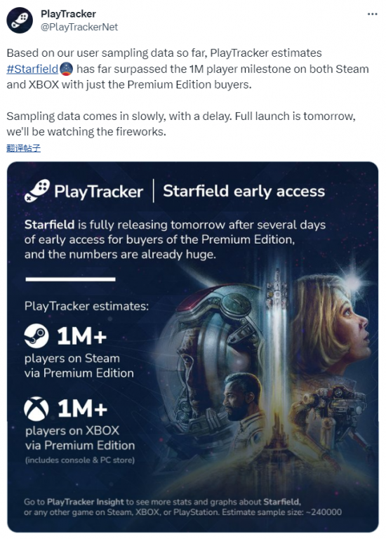 在《星空》发售之前,购买了高级版的玩家可以抢先五天体验游戏,而根据数据网站PlayTracker的采样数据显示,在抢先体验期间,《星空》在Steam和Xbox上的玩家数量均已超过100万,除了少数免费获取游戏的媒体和评论家外,所有玩家必须购买高级版游戏才能游玩,也就是说《星空》在抢先体验阶段销量可能就已经突破了200万。