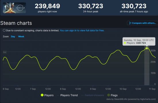 据Steamdb数据显示,9月10日晚上7点《星空》Steam玩家同时在线人数峰值已达330,723万。这也超越了《上古卷轴5》历史峰值(28.7万),但距离《辐射4》(47.2万)还有些距离。