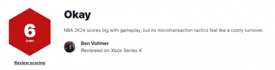 《NBA 2K24》已经目前已经正式发售,外媒IGN对这款游戏打出了6分的评分,认为该作在游戏性方面不错,但不得不忍受的微交易让人难受。