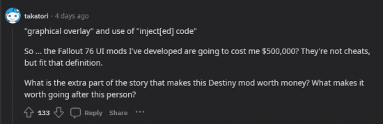 虽然大多数玩家对这样的判决反应是“喜大普奔”,但也有人担心这一判决可能会开创先例,导致一些大游戏公司可以对任何它们定义的“作弊”行为进行法律追究。例如在实时服务型游戏内的游戏内覆盖 UI Mod(类似《魔兽世界》里的插件)就符合 Bungie 在案件中对作弊软件的描述,这可能导致 Mod 制作者或使用者成为被指控的目标。