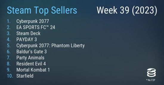 Steam最新一周销量榜出炉(2023年9月19日-2023年9月26日),本周《赛博朋克2077》成功登顶,并且DLC“往日之影”也排名第五,前三名还有《EA SPORTS FC 24》和Steam Deck。