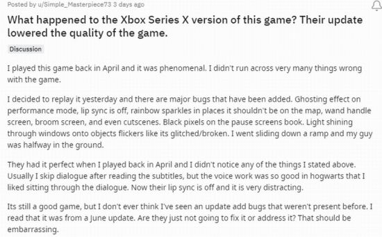 然而《霍格沃茨之遗》最近的新更新却引起争议,有人认为这些旨在增强游戏体验的更新实际上产生了负面影响。Reddit论坛网友Simple_Masterpiece73就发帖,表达了对最新更新的失望,特别是XSX版本。