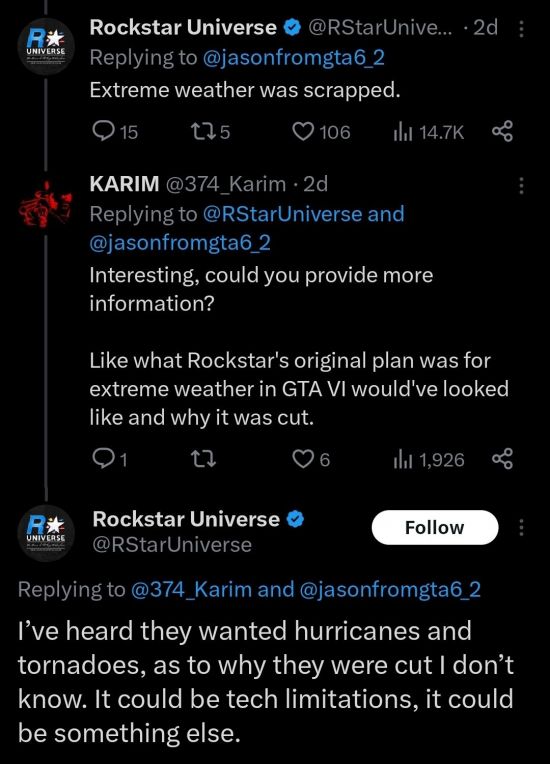 之前网传《GTA6》将引入全新天气系统,包含一些极端天气。但现在据Rockstar Universe消息称,极端天气系统可能已被删除,或是因为技术限制问题,具体情况未透露。