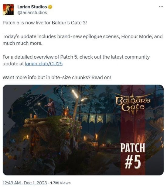 拉瑞安工作室《博德之门3》五号补丁现已正式上线,包括了全新的后日谈场景、新动画、荣誉模式、自定义模式、韩语支持和性能改进等内容。