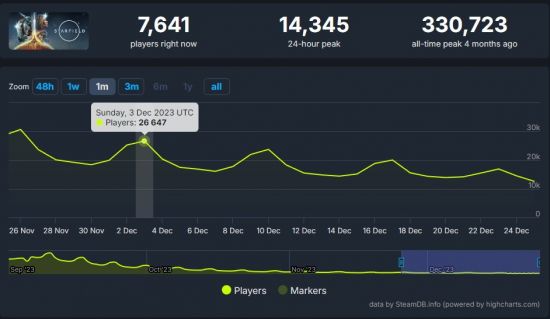 《星空》的玩家数量在不断减少,12月份该游戏在Steam上的玩家数又大幅下降。据Steamdb数据显示,11月份时,本作峰值人数能达到4万,但在12月份,本作峰值人数仅为26647人,平均人数保持在1万4上下。