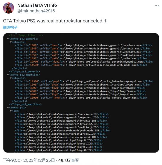 如上图,推主从代码中找到了含有“东京”、“PS2”,“模型”、“美术”等关键词,暗示R星很久以前曾计划将《GTA》的舞台设置在日本东京,但很遗憾未能落实。