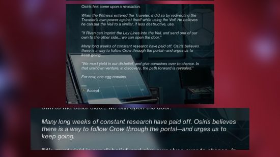 在《命运2》的全息投影简报中有这样一句话:“欧西里斯相信有一种方法可以跟随乌鸦通过传送门,并敦促我们继续前进。”