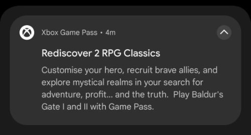 该推送写道:“重新发现两款RPG经典。定制你的英雄,招募勇敢的盟友,并在寻找冒险、获利、探索神秘的领域和真相。用Game Pass玩《博德之门1》和《博德之门2》。”