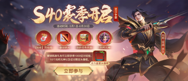 S40赛季:楚汉争霸赛季活动更新来袭,除排位奖励、赛事更新和新增征讨四方奖励外,还有全新赛季闯关地图等你来挑战!