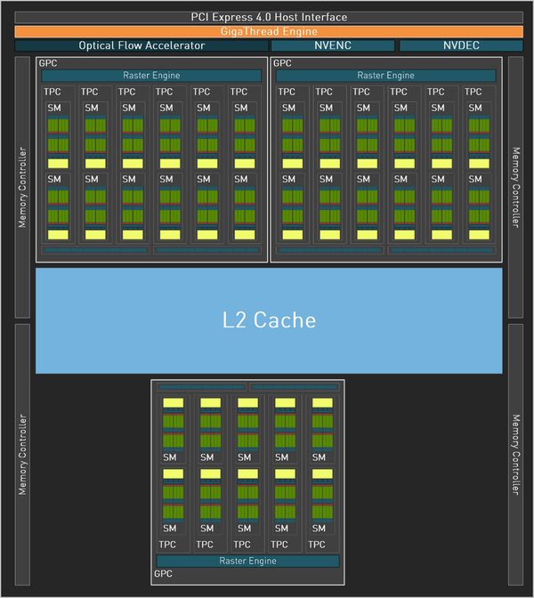 那么在核心规格方面RTX 4060 Ti采用AD106-350,依旧基于NVDIA台积电4N工艺定制工艺打造,配备4352个CUDA核心,拥有8GB GDDR6显存,显存速度为18Gbps,显存带宽为288GB/S,显存位宽为128Bit,具备32MB L2缓存,整卡设计功耗为160W,视频播放13W、待机功耗7W,它也具备全新的AV1编码,该卡的单精度浮点算力为22 TFLOPs、34个RT核心算力为51 TFLOPs,136 Tensor核心算力为353 TFLOPs,从核心来看拥有三组GPC,其中一组GPC少了一组TPC,总共34组SM。