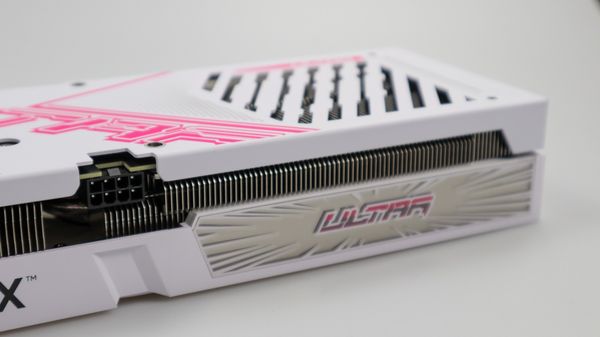 来到显卡本体,七彩虹iGame RTX 4060 Ti Ultra W OC 8GB整个设计采用波普艺术风格,代表着年轻的新生代群体不随大众的风格,整个显卡颜值看上去还是非常在线的,由于是整个以白色为基底,所以任何图案都显得比较清楚和显眼,整个散热风扇也拥有大面积的彩绘,而且具备渐变效果,色彩会随着光线的照射展现出不同的颜色,设计上是比较讨巧的。