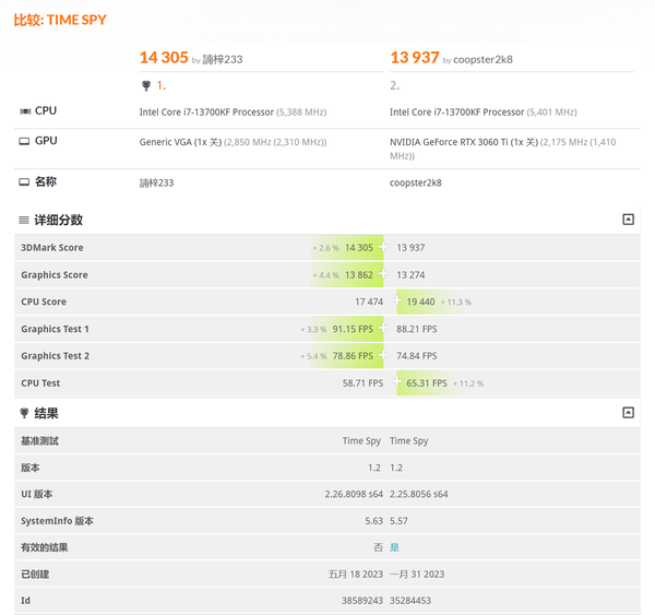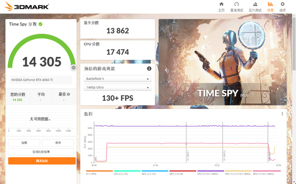 Time Spy作为当下DX12的基准测试,七彩虹iGame RTX 4060 Ti Ultra W OC 8GB 在此项中综合分数为14305分,显卡分为13862分,在线与同配置的RTX 3060 Ti对比分别在测试场景1和2中有3.3%和5.4%提升。