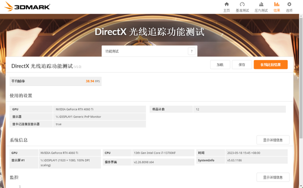 纯光追测试下,七彩虹iGame RTX 4060 Ti Ultra W OC 8GB为38.94帧。