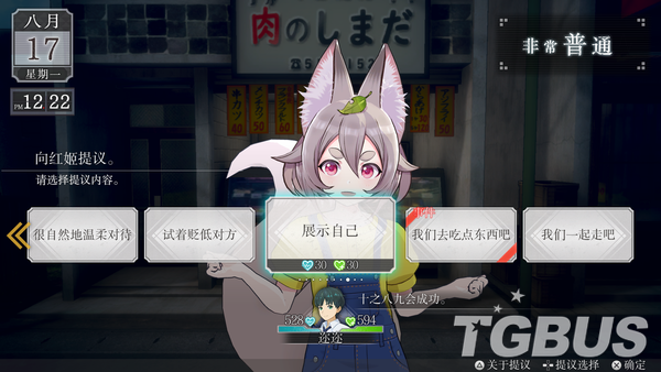 游戏中的选项对所有角色都是共同的,通过一些匪夷所思的对话从而进行好感度的增减。选项中,玩家也可以看到所消耗的体力和精力。虽然消耗的不是很多,如果玩家想要为某个角色提升数值的话,一直找他/她说话就可以了,并不会消耗所谓的行动值,但需要注意成功率会逐渐下降。