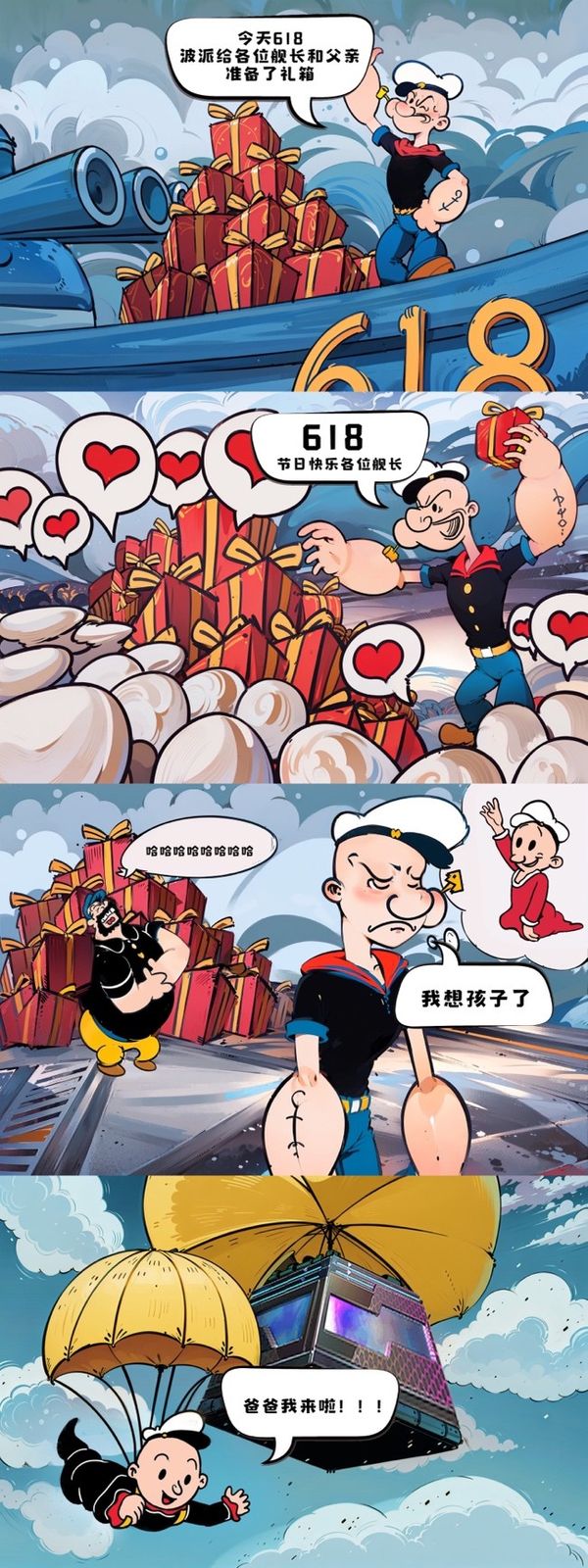 漫画的场景大概讲述了大力水手作为一名舰长为大家送去各种618的福利礼物,工作结束自己失落地坐在一旁思念自己的孩子。而布鲁托则是贱嗖嗖的故意炫耀自己有许多礼物,结果被大力水手“反击”,自己的礼物和孩子都“天降而来”,其乐融融地一起开箱,还开出了炫彩舰船,剩下布鲁托在一旁狠狠emo。