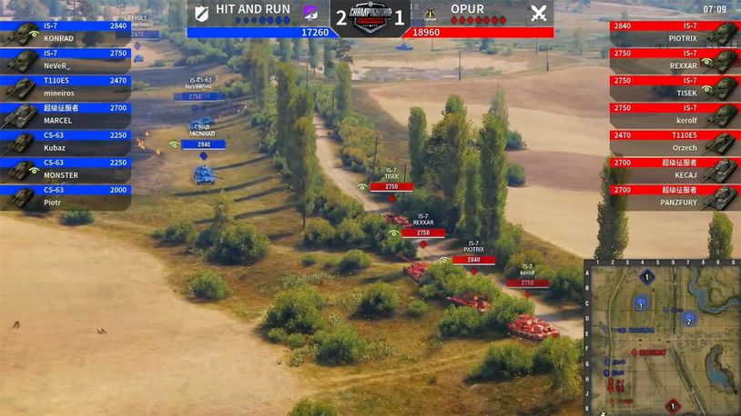 HIT AND RUN率先拿到赛点,双方在本场都采取了激进的前压策略,并在D3区域爆发了激烈团战,mineiros驾驶AMX 50B在残局1v3的战斗中收掉两人,但在面对705A的单挑中回天乏术,OPUR扳回一局,4:3。
