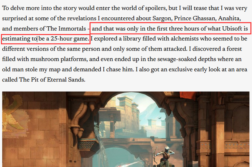 在外媒Game Informer一篇《波斯王子:失落的王冠》试玩&采访文章中有提到这样一句话:‘’这只是育碧估计的25小时流程的前3小时”。