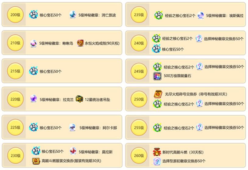 高能斗燃角色从11级开始,等级每提升1级均享受额外提升2级的福利。*11级之前、260级以后,成长特权消失。