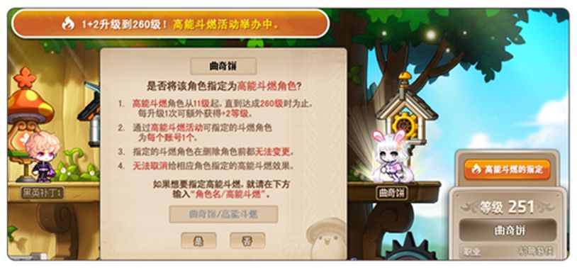 游戏内每个账号只能设定1个高能斗燃角色,且一旦确定后将无法更改。完成剧情任务第2章的200~258级神之子角色和原角色,可以点击角色选择窗口右侧的[高能斗燃的指定]键,指定为高能斗燃角色设置完成后,在角色选择界面中,高能斗燃角色将出现特效显示。