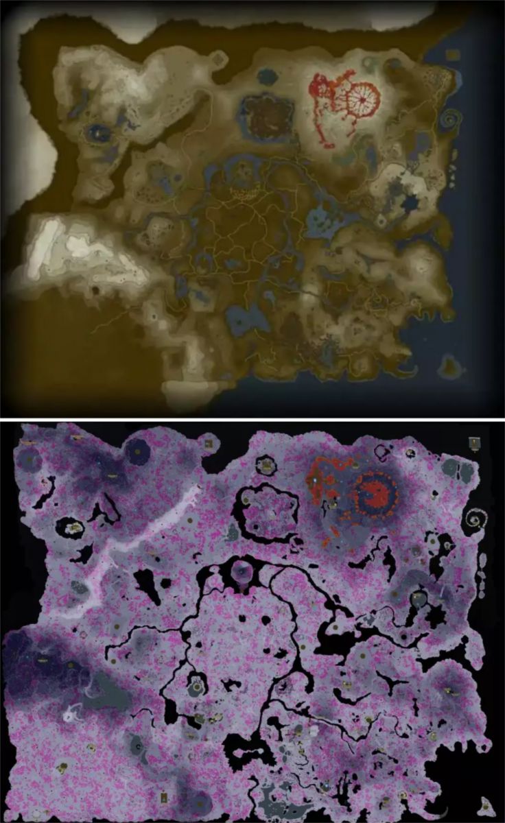 而跨越地图图层的关系链条则是利用一种地图的镜像对应。像海拉鲁大陆的陆地地图与深渊地图是有大量对应的特点,比方说,深渊的核心资源点矿场对应的是陆地上的村子;比方说,深渊的树根对应的是陆地上的神庙;再比方说,陆地上的河流对应的是深渊的高山,诸如此类的对应关系在游戏里非常常见,三层地图彼此照应,设计的分布更有逻辑。