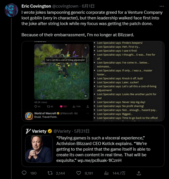 在昨天(6 月 1 日)《综艺》杂志刊登了动视 CEO Bobby Kotick 的采访。在采访中他的一些引发了许多人的不满,包括动视暴雪的员工,其中就有前《魔兽世界》编剧 Eric Covington。