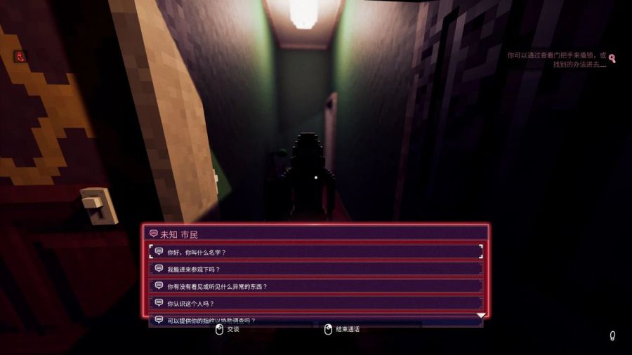 街区模拟的真实性,是侦探扮演感的主要来源。每个市民都有自己的工作,有自己的住所,饿了会去餐馆,病了去诊所,偶尔喝下咖啡、商超购物,或者去酒吧快活。程序生成的随机性与内容量就是向玩家下达的挑战书,在茫茫人海中找出真凶就是游戏成就感的来源,他们像一名侦探一样调查现场,确认身份、收集指纹、打听消息,将未知转换为已知,将已知建立起关联,用行动验证想法,玩家也许能提炼一些信息搜集的共性,但案件的破解过程不会撞车,毕竟,每个案件都是独一无二的。街区模拟的真实性,是游戏体验的另一构成。“我们在一些测试中发现,沉浸感与在城市中的角色扮演是玩家真正喜欢的事情,所以我们试图加重这一块的比例,让玩家生活在这个世界中。” Cole Jeffries在封测后的日志中如此写道。在推理之外,《Shadow of Doubt》其实还加入了一系列的状态管理,如饱食度、饥渴值,误食过期食品会肚子痛,从高处摔下会受伤,需要绑定木板才能跑步,购买装备需要金钱,游戏想为玩家提供生活在其间的体验。它也为玩家提供了充足的交互手段,游戏内上千件物品都可交互,每个NPC均能对话,玩家进入某个上锁的房间多种多样:强行破门、从通风口潜入、在地毯下方找钥匙、撬锁……