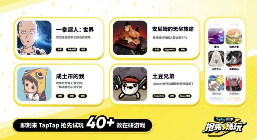 “抢先畅玩”、“大派福利”,从玩家需求出发营造“节日狂欢氛围”此番“TapTap游戏节”中“抢先畅玩”内容环节,提供了超40款在研游戏,供玩家在游戏节期间抢先体验,不仅数量规模充满诚意,并且悉数为玩家喜爱的高热度精品。比如说顶级动漫IP新作《一拳超人:世界》、众星捧月的学生作品《成土市的我》,以及一系列诸如《了不起的修仙模拟器 移动版》、《土豆兄弟》等好评如潮的独立游戏移植作品,都在“抢先畅玩”之列。