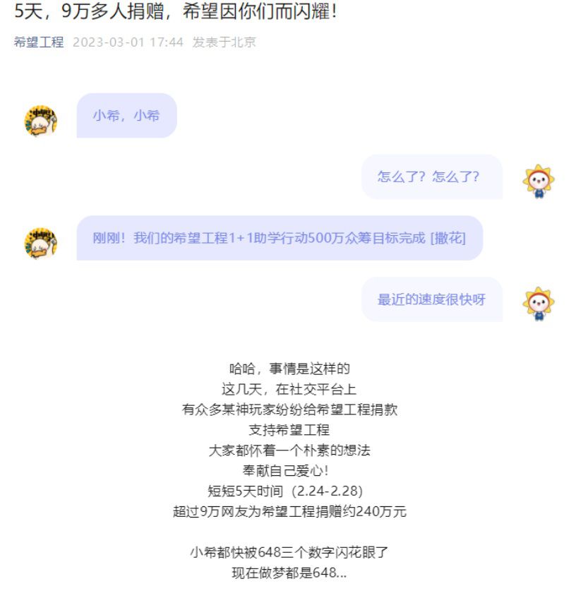 第三,将玩家的参与行为与公益相联结,支付宝积攒的绿色能量可用于蚂蚁森林的公益种树,与Keep的联动收入将用于运动相关的公益活动,且联动达标后会向欠发达地区的小学捐赠多功能运动场、体育运动器材,玩家的绿色行为、健康生活附加了公益价值,米哈游希望这份快乐能散播到更隐蔽的角落去。《原神》在这些联动中体现出来的社会担当,获得了玩家、媒体的一致认可,有玩家指出,并不需要美化玩家的行为,他们只是凝聚在一款优秀的作品下,朝着官方引导的正确方向前进而已。