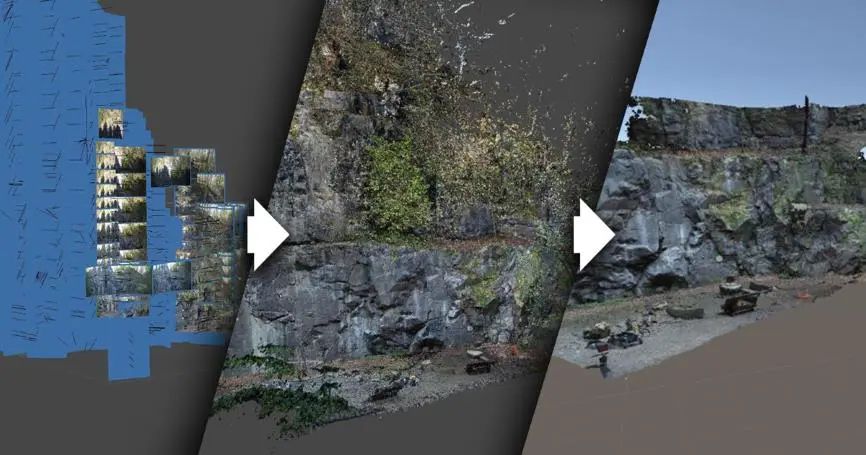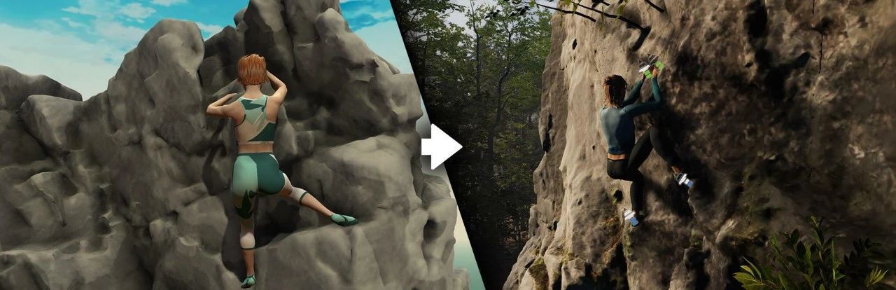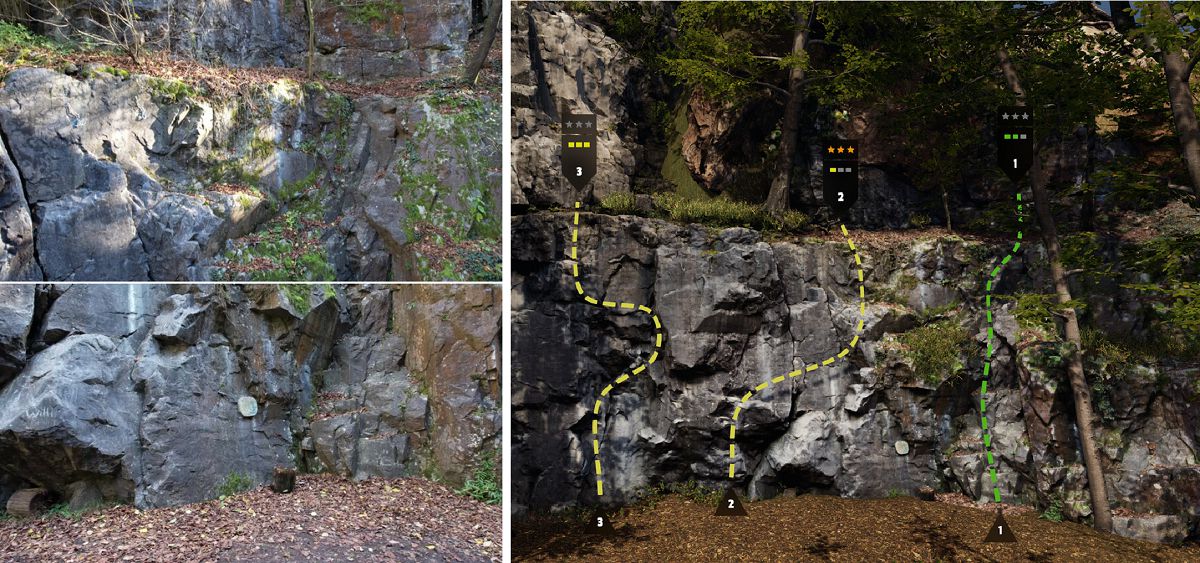 回到办公室后,Wikkl Works团队开始着手处理拍摄到的视频和图片,并采用了一些办法来对齐照片后将其转换为3D模型(在图片中创建密集的点后借助Metashape的功能制作网格,并为网格创建纹理的大小和数量,当然也要注意系统开销)。3D模型建成后再处理细节烘焙法线贴图,生成遮挡贴图使环境光融入模型中。考虑到攀爬系统需要作用于岩石, Wikkl Works的做法是将密集的网格切割成块并创建单独的LOD,当攀爬者接近岩石时才会显示密集版本,而远处的则为较低分辨率显示。左边为真实拍摄 右边为游戏构建场景(还原度相当高)