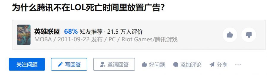 前几日,在知乎的推荐流里看到一个问题,“为什么腾讯不在LOL死亡时间里放置广告”,从游戏设计角度来讲,在多人竞技游戏的死亡时间里,玩家仍存在操作或决策空间,如更新装备、给队友发提示等,播放广告无异于自焚。
