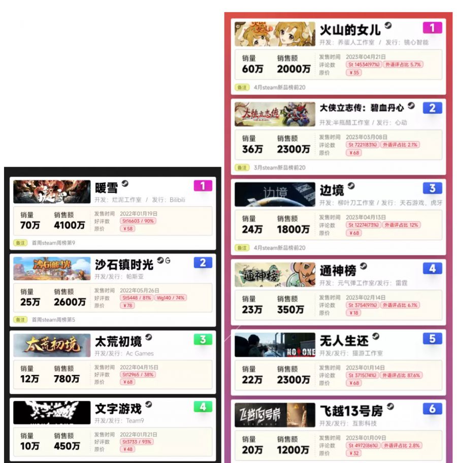 除了《风来之国》外,其他几款游戏都是百万销量起步
