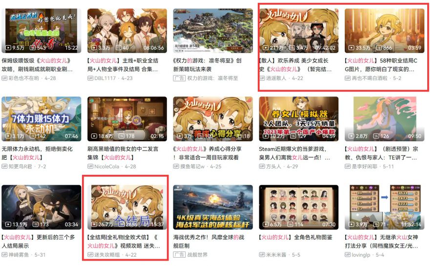 《暖雪》与《火山的女儿》得到对比,同为同期的头部游戏,视频的流量差距非常明显,除了散人作为大V自带的流量,其他人的播放水平都差《暖雪》很多