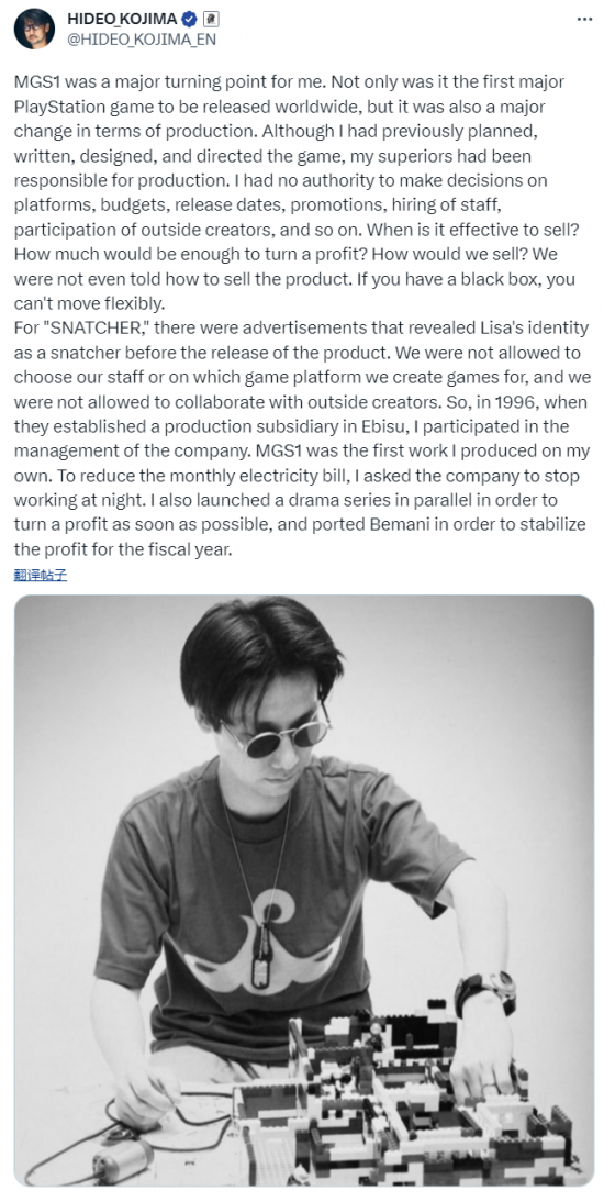 小岛秀夫发文表示,距离《合金装备V:幻痛》已过去了8年,而25年前初代《合金装备》发售时,他已经35岁了,这款游戏对他来说是一个重要的转折点,不仅是他制作的第一款游戏,也是第一款在全球发行的PlayStation游戏。虽然之前他也策划、编写、设计过游戏,但制作是由其上级负责的,他无权决定游戏发售平台、预算、发布日期、营销、员工、外包等内容。此外,为了稳定游戏发售财年的利润,小岛秀夫还要求公司晚上停止工作减少电费,并推出电视剧以求尽快扭亏为盈。