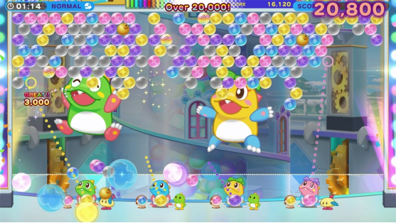 《益智泡泡龙:一起泡泡战!》是 1986 年以街机游戏亮相并掀起热潮的 TAITO 公司的授权游戏《泡泡龙》系列的衍生作品—《益智泡泡龙》系列的最新作品,是款具备向上发射 3 个同色泡泡,射中的话就会引爆的简单规则的动作益智游戏。本作故事模式支援首次加入的四人协力游玩,其中「骷髅塔」更支援在线排名功能,还有与全世界的玩家一起较劲的连线对战功能以及透过两人合作的2 vs 2协力对战等各种游玩方式。除此之外,也收录了45周年纪念合作迷你游戏《益智泡泡龙vs侵略者》,有非常丰富的游戏玩法。