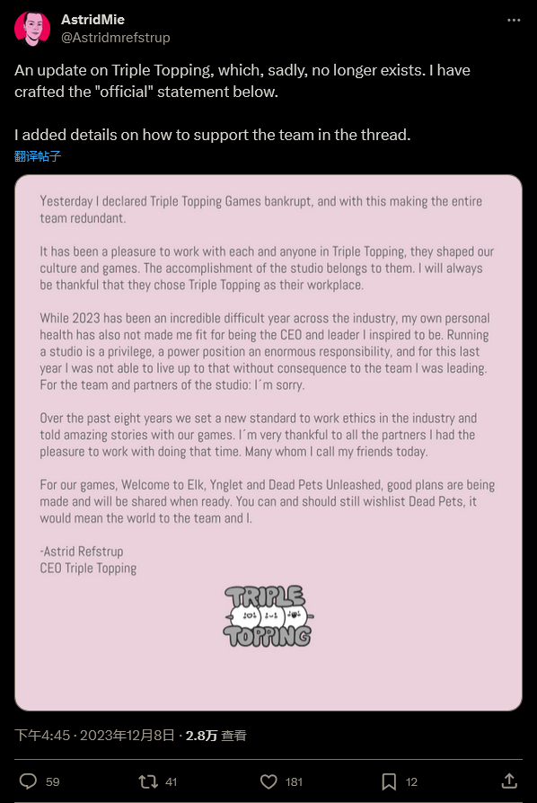 在公告中,工作室首席执行官 AstridRefstrup 表示,2023 年对工作室来说是非常困难的一年。在社交媒体上她表示:“经营一家工作室是一种荣幸,也是一个权力地位,一种巨大的责任,在过去这一年里我没能在不影响我所领导的团队的情况下尽责。对于团队以及工作室的合作伙伴,我想说:对不起。”