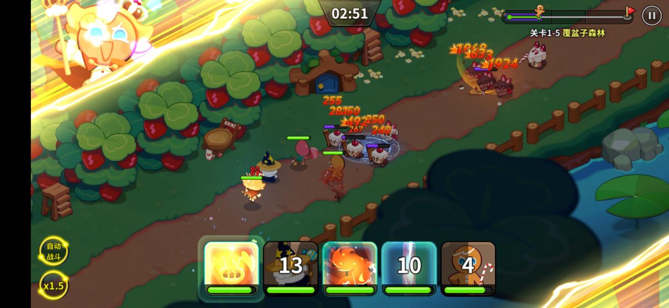 接下来是游戏的战斗环节,主要是以横版推图的形式来进行的,玩家最多可以派遣五名职业不同的饼干,基本分为治疗、输出和防御、魔法等等,再加上可以选择的三件宝物获得额外增益效果,以此来战胜敌人。整个战斗环节有自动战斗,直接解放双手,追求极致的大佬们也可以全程手动战斗,来挑战越级打怪。