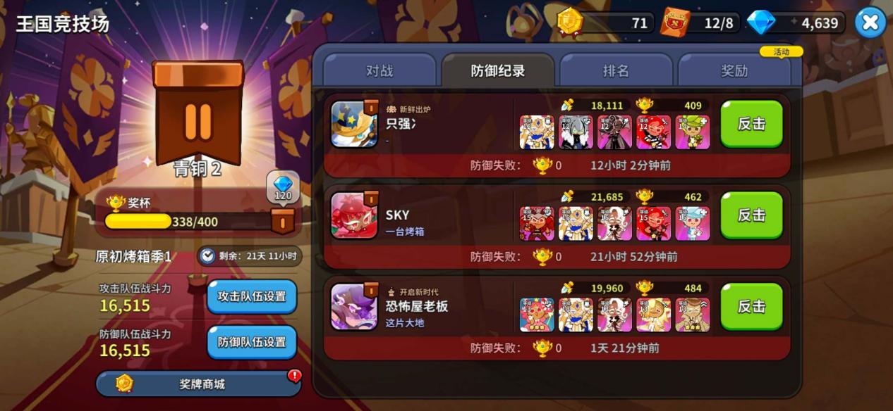 除了以上的PVE玩法,还有一个王国竞技场的的PVP玩法,需要入场券才能进行,每天有8次对战机会,有段位分级,还可以查看防御记录,对之前没有打过的人可以发起反击,俗话说得好,君子报仇十年不晚,这次我打不过,下次可就不一定了。