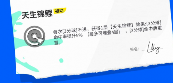 李鲤的被动技能叫天生锦鲤,听到这个技能名称,相信很多小伙伴们都能猜到与三分球有关!没错,李鲤每次三分球不进都能获得一层天生锦鲤的效果,每层叠加命中率5%,最多可以叠加4层,三分球命中后重置!三分球在篮球竞技中的重要性不言而喻,尤其是《全民街篮》快节奏主打3V3的游戏来说,一场对局外线球员能够出手的次数真不少,每次新发球或者是抢到篮板都要退出三分线以外才能开始进攻,这也使得李鲤成为游戏中SG位置热门之选。