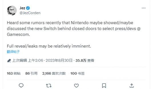 Windows Central记者Jez Corden最近表示他听到一些传言,任天堂可能在德国科隆展期间向部分媒体和开发者闭门展示或讨论了Switch 2。很快就有相关的泄露。