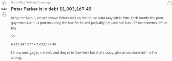 有人认为,尽管彼得·帕克的房子是在纽约市中心好地段,但还是太贵不太合理。还有人认为按照蜘蛛侠的身手,想要还清债务不是问题。只要做点坏事,应该很快就能还清债务,但彼得身为英雄,是不会这么做的。