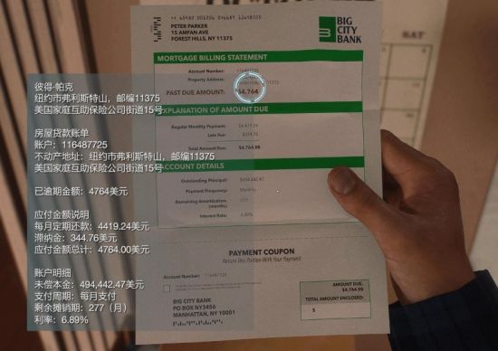 国外Reddit论坛有网友计算了来自游戏内银行“Big City Bank”寄给彼得帕克的房产抵押贷款帐单,上面标示彼得一个月要偿还4419美元的贷款,但因逾期未缴纳要加上滞纳金,应付金额达到4764美元。剩余的还款次数为277次,也就是说从现在开始每月按时还款,彼得需要大约23年才能偿清,总计需要支付120多万美元。
