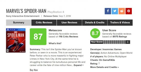 不过索尼第一方游戏并不都是达到90分,《地平线:西之绝境》媒体评分88分,《漫威蜘蛛侠》87分,《往日不再》71分。