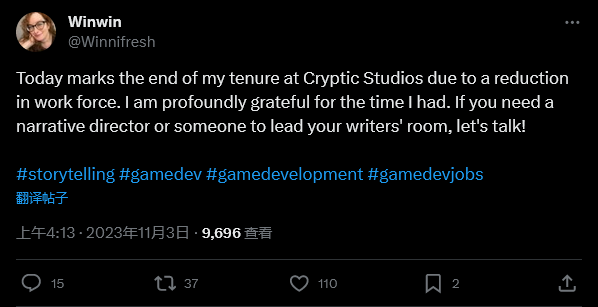 工作室叙事总监Winter Mullenix在社交媒体上发帖表示,由于“劳动力缩减”,她已经不在该工作室了。